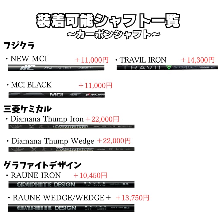 ※掲載されているシャフトやグリップ以外をご希望の場合はお気軽にご相談ください。